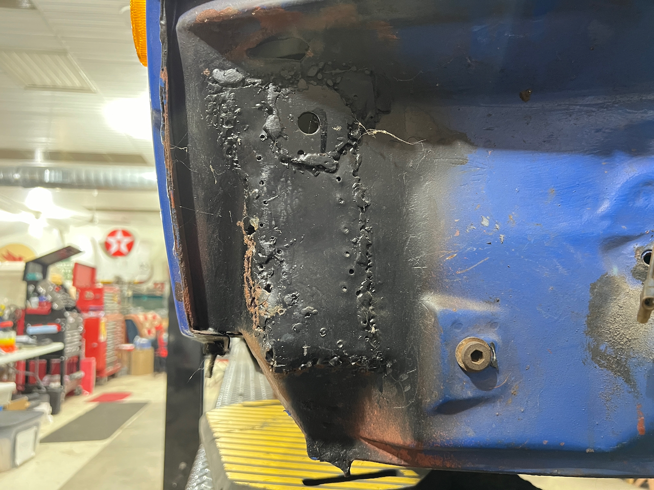 I've done this repair before. Its not too bad but the bumper mount, if you have to replace it, is a PITA to get off. Hmm. It appears you have the fender off in your photo. I'm guess that will be necessary if order to get access to weld the bumper mount to the frunk sidewall? Did you need to remove the fender for this repair? This is becoming a very slipper slope! Short term, I am tempted to just drill a hole and weld on another washer for the bottom mount. (IMG:style_emoticons/default/smash.gif) No, I think you can replace the bracket without removing the fender. However, I'm not convinced you need to replace it. What about just welding in the section that is rusty? I'd cut a rectangular hole out of the front cross (around this rusty area). Make it big enough to get in there to the bracket and then just cut and replace the part of the bracket that is rusted? Unless you have a hole in it going into the light bucket like I did, I'd just weld in a new section. Hell, buy the RD part and just use what you need. That would be a pretty easy repair, IMO. |